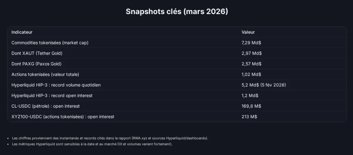 Le week-end de mars 2026 l'a prouvé. Choc géopolitique, pétrole et métaux en forte hausse les contrats or et argent sur Hyperliquid ont totalisé plusieurs centaines de millions de dollars de volume en 24 heures. Un dimanche. La profondeur de marché des commodités tokenisées a franchi le seuil où elles deviennent un vrai lieu de formation des prix.