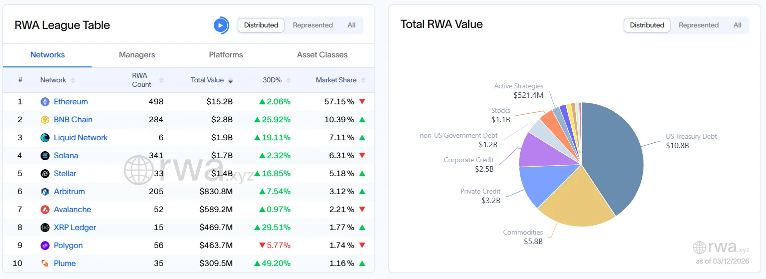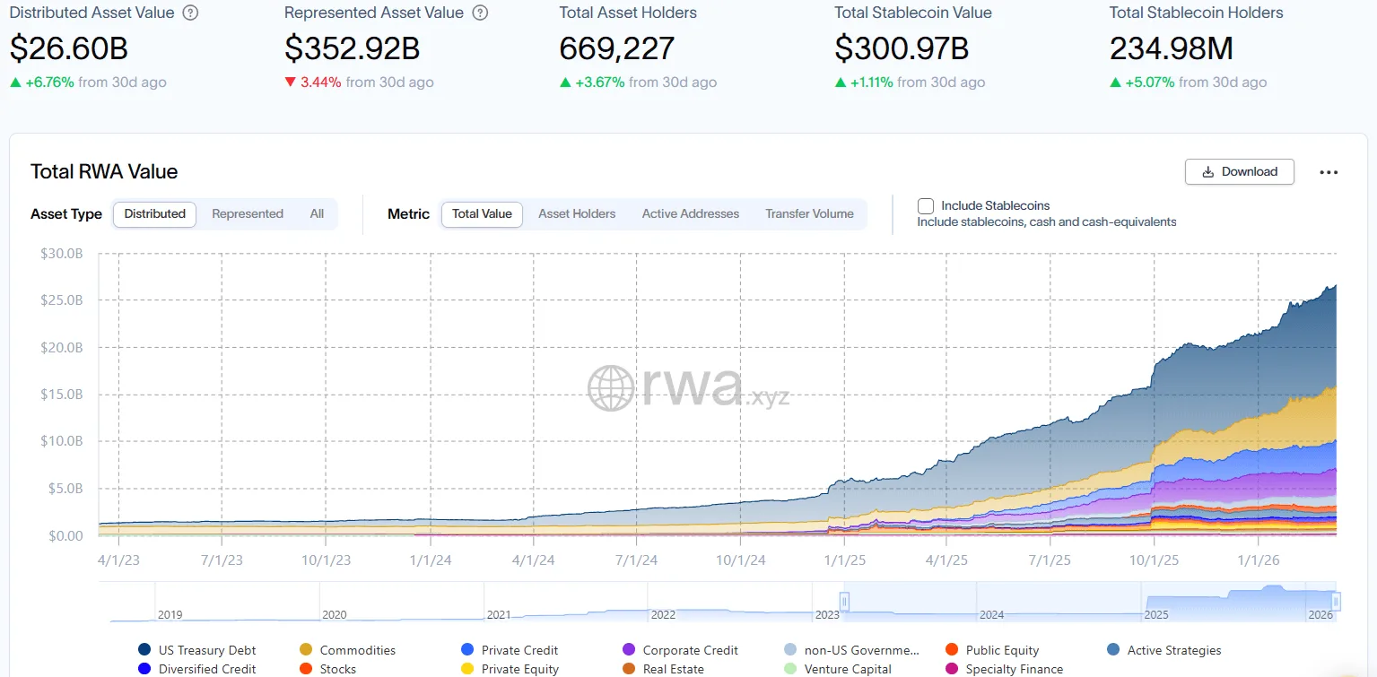 Le marché des actifs tokenisés (hors stablecoins) pesait environ 5 milliards de dollars en 2022. Au 9 mars 2026, RWA.xyz affiche une valeur d'actifs distribués de 26,4 milliards de dollars, en hausse de 8% sur les 30 derniers jours. La capitalisation totale RWA on-chain est estimée à 21,9 milliards de dollars, avec 665 262 détenteurs un chiffre en croissance de 4,4% sur un mois.