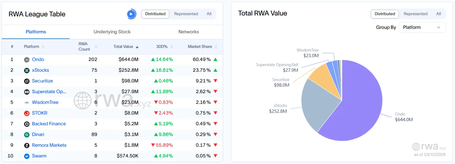 Le marché se structure rapidement autour de quelques acteurs. Ondo domine avec 58,3% de part de marché (588,7 millions de dollars, 202 actifs). xStocks (Backed Assets) tient la deuxième place à 23,7% (238,7 millions, 75 actifs). Securitize gère un seul produit, les actions Exodus Movement (EXOD), mais il pèse à lui seul 97,9 millions. Et puis il y a Robinhood : 1 539 actifs listés pour seulement 15 millions d'encours. Le catalogue est en place un signal clair que l'infrastructure attend les volumes.