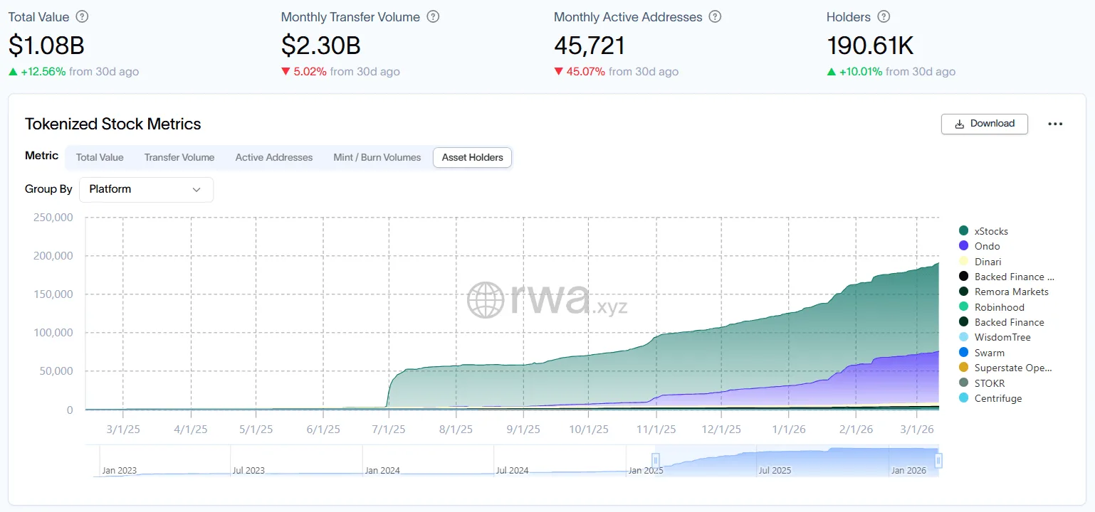 Le signal le plus fort vient de la base d'utilisateurs. 185 400 détenteurs, en hausse de 12,5% sur un mois c'est le taux de croissance le plus élevé de toutes les classes d'actifs RWA. Ce n'est plus seulement de l'encours qui gonfle. Ce sont de nouveaux utilisateurs qui arrivent, qui ouvrent des positions, qui commencent à intégrer les actions tokenisées dans leurs portefeuilles.